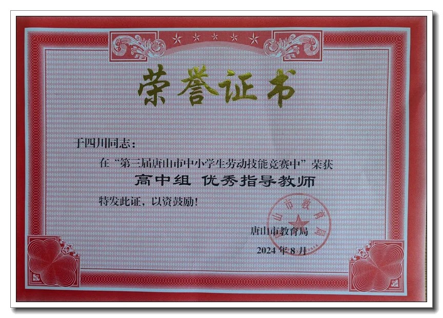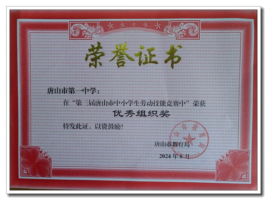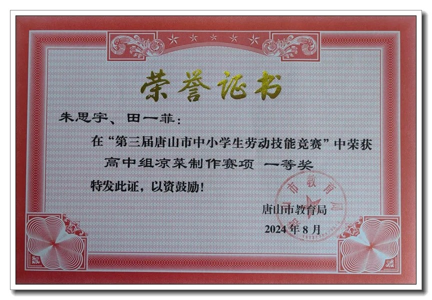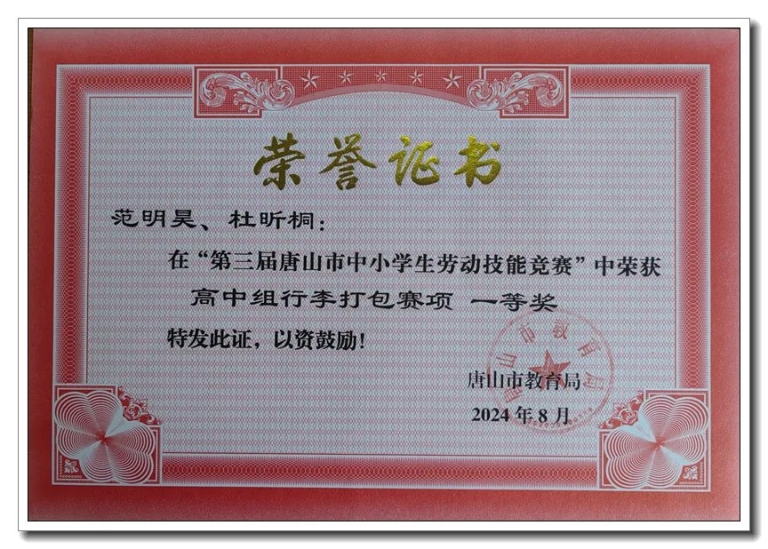 与此同时,在七月底举办的“第三届唐山市中小学生劳动技能竞赛中”,我校高一七班的四位同学不畏强敌,一路过关斩将,最终,范明昊、杜昕桐两人获高中组行李打包赛项一等奖,朱思宇、田一菲两人获高中组凉菜制作赛项一等奖,为学校争得了荣誉。市教育局也为我校颁发了优秀组织奖,于四川老师被评为优秀指导教师。